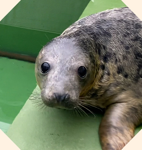 Nobbly Bobbly is our biggest pup at 30.7kg and he’s grown-up enough to be hand-fed fish. We rescued him from a beach in Devon, after he was seperated from his mum in a storm. He has