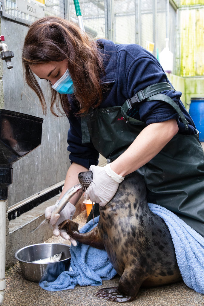 Once they’ve seen a vet, we move some seals into a safe indoor cubicle which makes it easier for carers to check up on them and help them at mealtimes. Young pups need to be tube-fed a mixture of liquidised fish every three hours. And older ‘teenage’ seals sometimes need someone to help them open their mouths before we ‘post’ fish in!