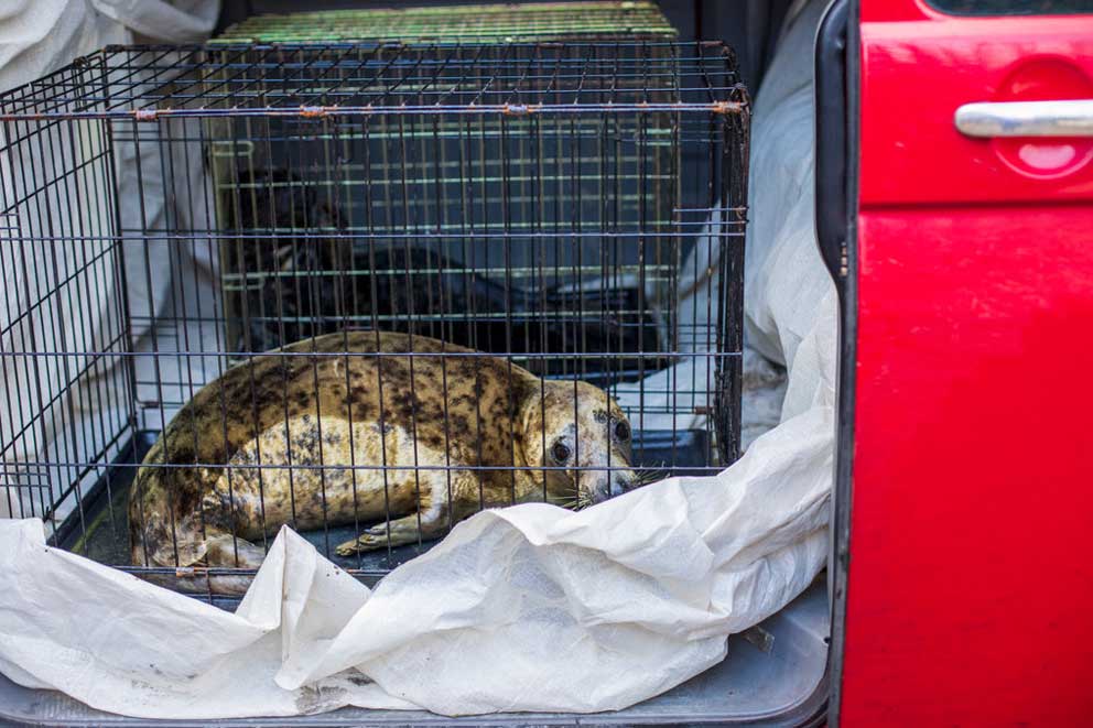 Two or more animal rescuers will guide the seal into a carrier, which they carry carefully to a van. Then it’s off to a wildlife centre where the seal will be treated by a wildlife vet